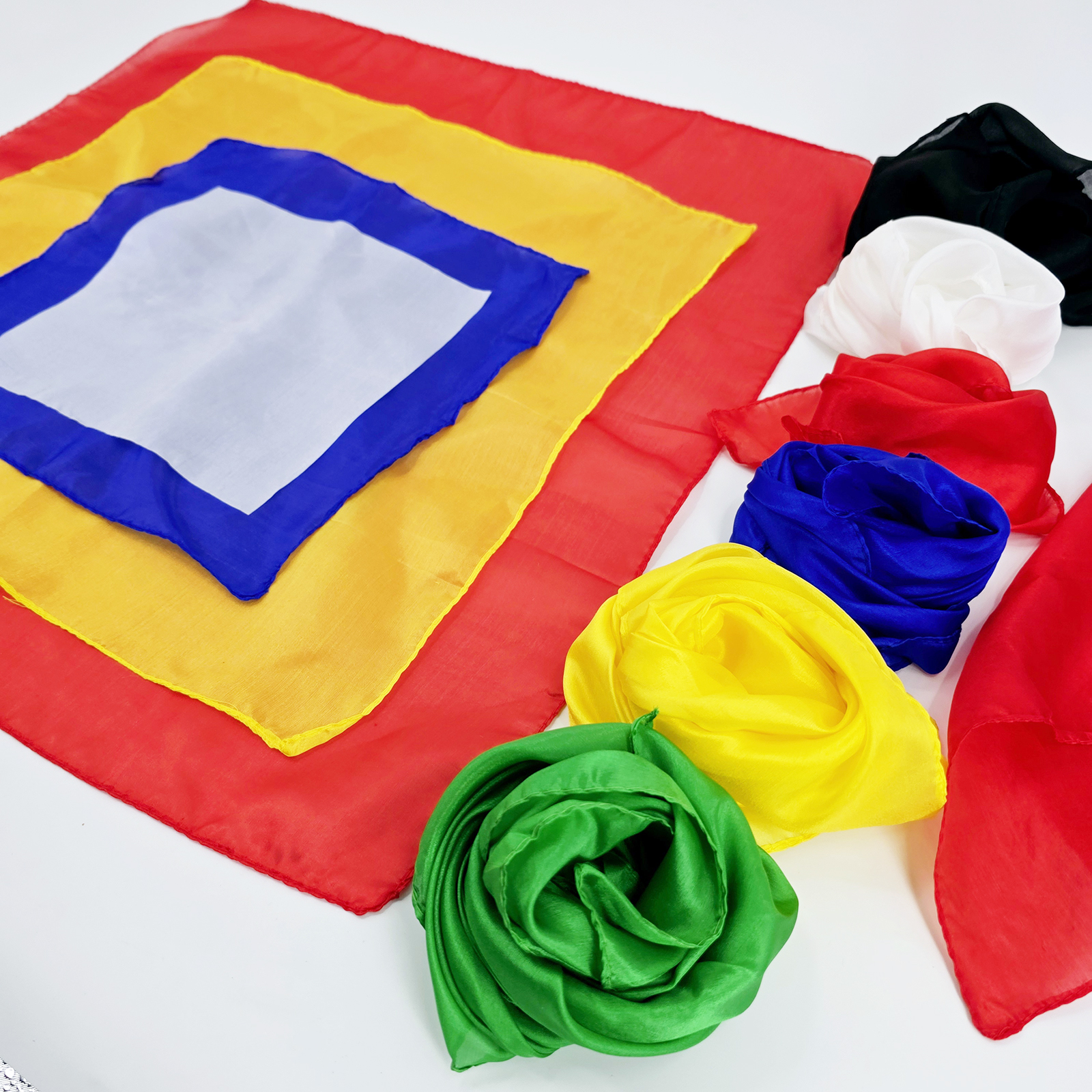 舞台协同:大尺寸丝巾(如60cm)适合与雨伞、扇子、棒类道具进行大型舞台变幻,营造瞬间爆发的视觉画面;小尺寸(如15cm)则专精于近景手法,易于在指尖藏匿与闪现。